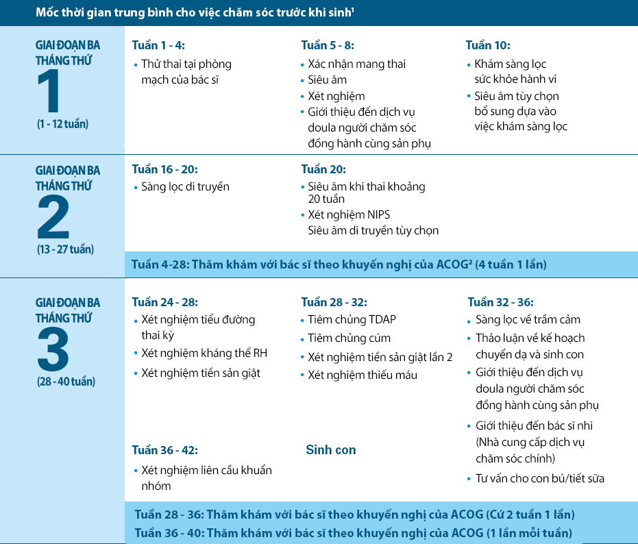 1Nguồn: https://www.mayoclinic.org/healthy-lifestyle/pregnancy-week-by-week/basics/healthy-pregnancy/hlv-20049471; https://www.mayoclinic.org/healthy-lifestyle/pregnancy-week-by-week/in-depth/prenatal-testing/art-20045177; https://www.acog.org/womens-health/infographics/prenatal-genetic-testing-chart; https://www.acog.org/womens-health/faqs/routine-tests-during-pregnancy.
